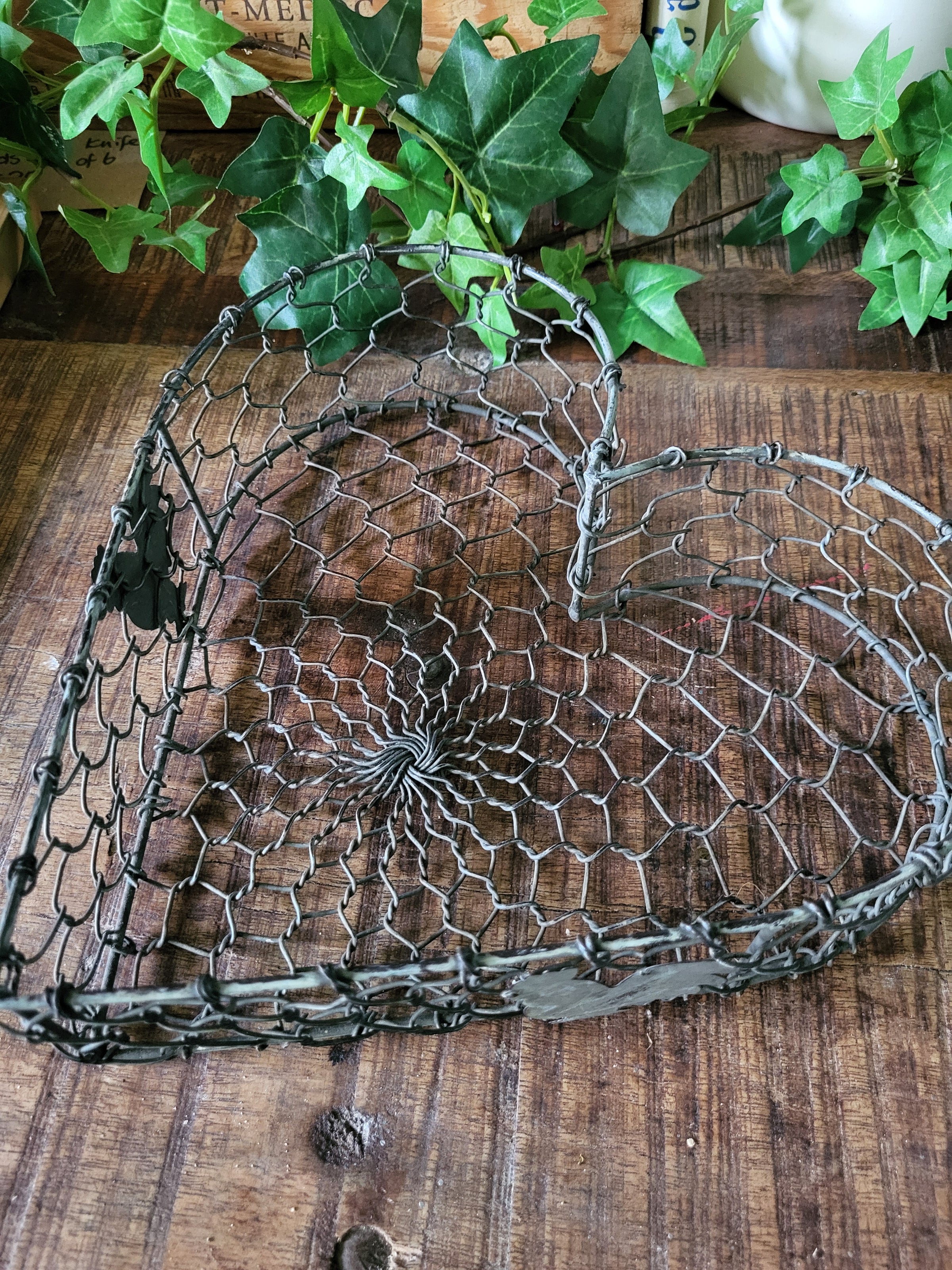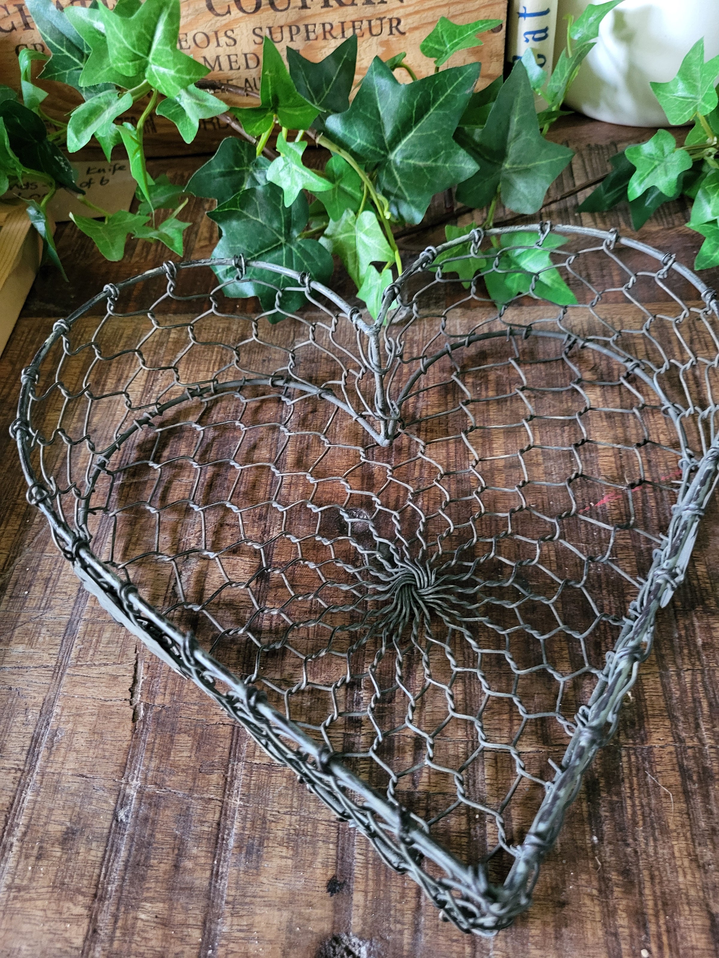 Heart shaped wire basket with hen motifs on the sides. Perfect for displaying eggs in the kitchen.