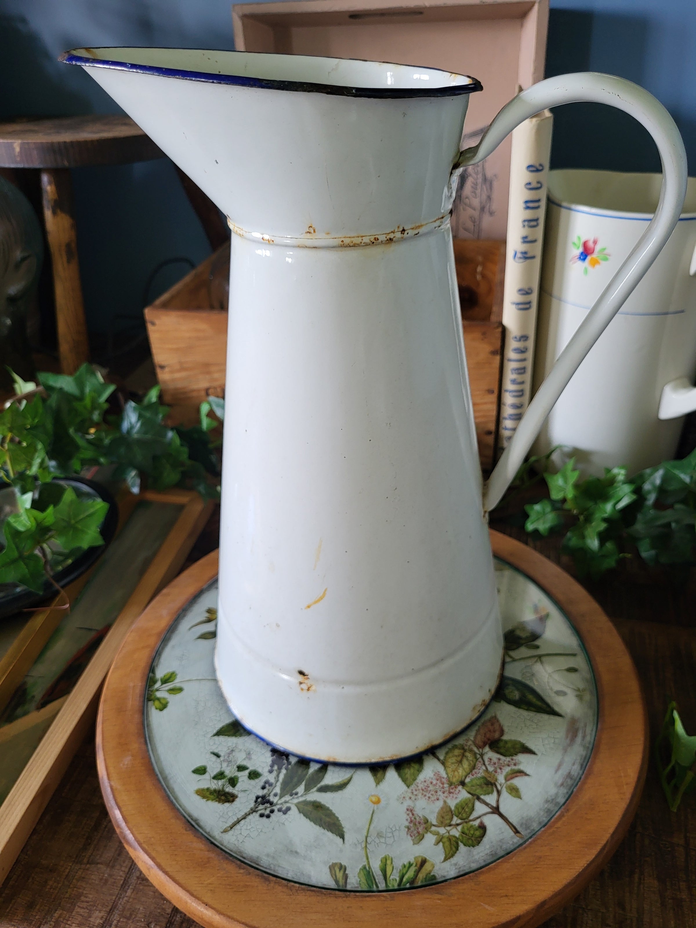 Add a touch of vintage charm to your home with our French vintage white enamel pitcher jug, with French Navy trim. Perfect for displaying flowers.